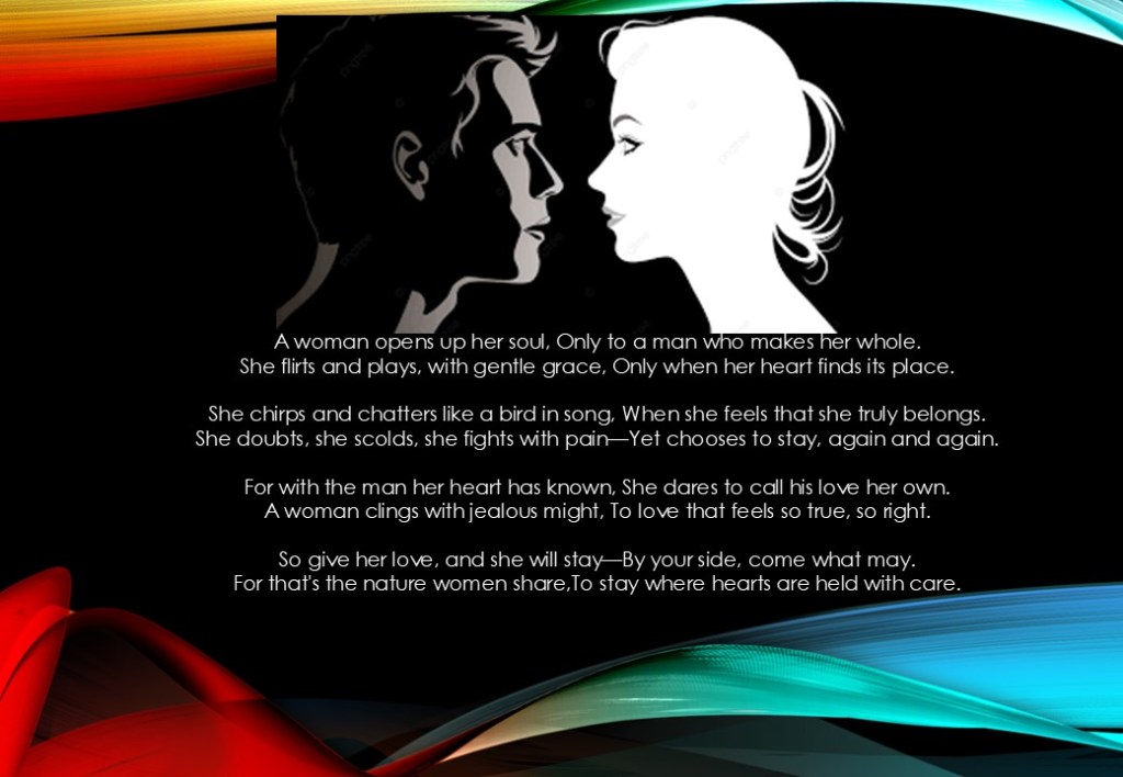 There’s also a raw honesty in the final lines: “A woman clings with jealous might / To love that feels so true, so right.” When a woman truly loves, she becomes emotionally invested. Her need to stay close is not always about control or insecurity, but about connection, about anchoring herself to what feels meaningful and irreplaceable.